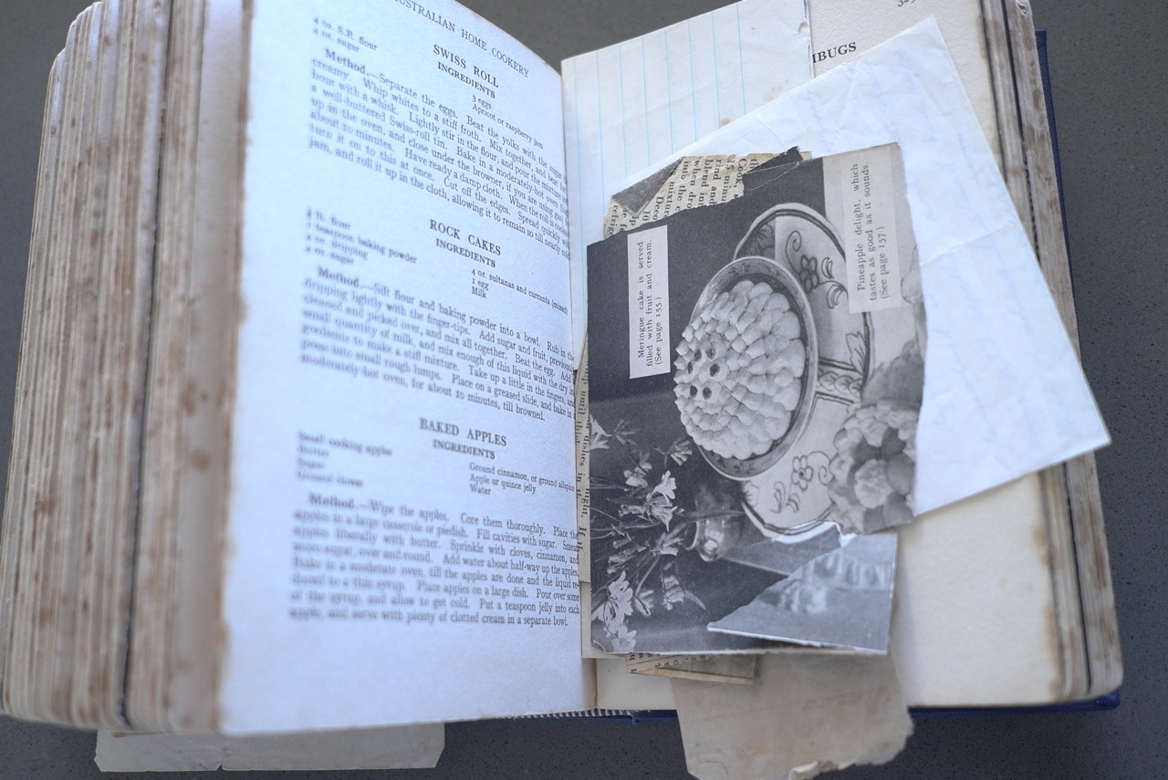 Boris spotted it as it was old, dog eared and well thumbed. It was also full of pencilled notes in the margins of recipes and, tucked between the pages, snipped out recipes from newspapers or written scraps of paper with little notes – “mum’s best pie”…”Uncle Johns favourite”. On the back of a notepaper with a recipe for Sour Cream Cake, is a child’s drawing of a cat and laboriously printed “Cameron.”