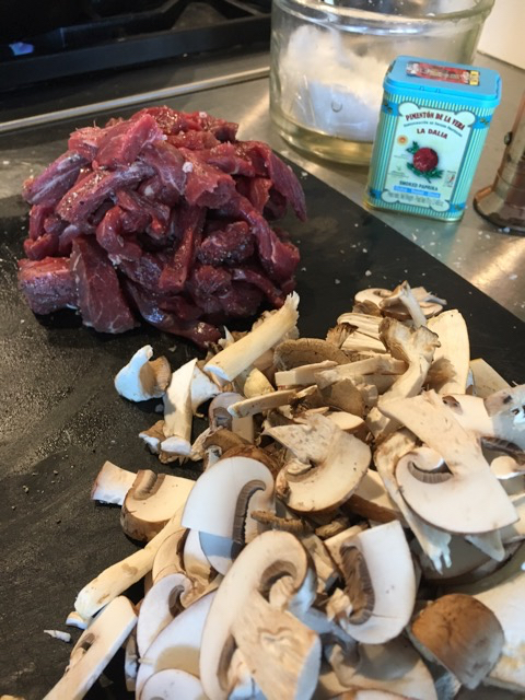 Add Paprika, Beef and sour cream. Stir to combine over a low heat for 2 minutes.