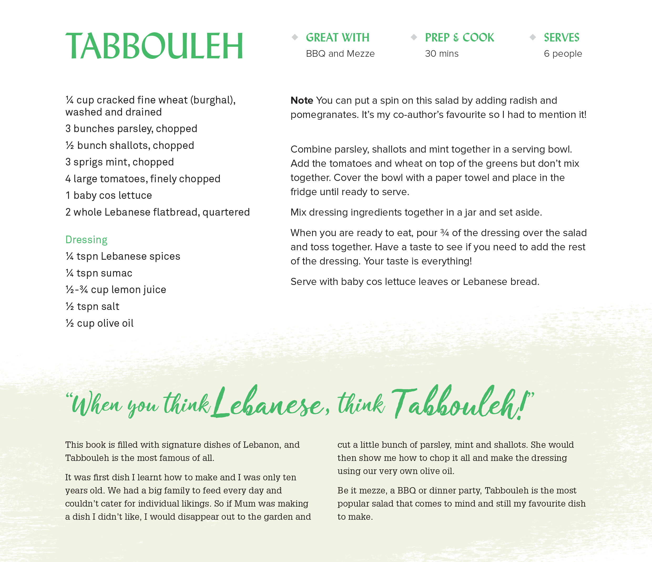 Mon likes to give her recipes a Mediterranean twist; ‘Meat falling off the bone, lots of flavour, lovely fresh berlotti beans, not just Middle Eastern flavours. My food is inspired by Greece, Turkey, Italy, Morocco, Spain, a little bit of everything! Now you can get spices like Sumac, continental meats and Lebanese bread everywhere.’