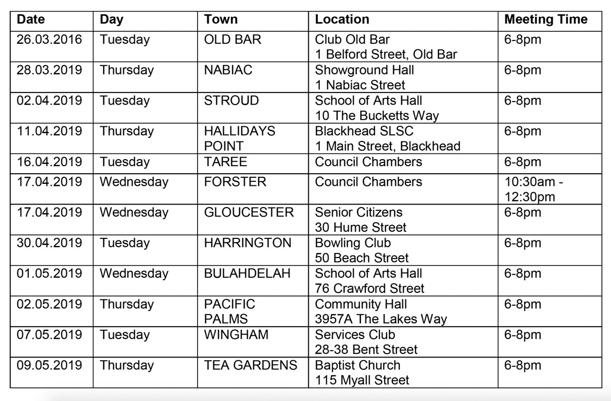 MidCoast Council has now scheduled the next round of community consultations. So get along and express your views on the matters that concern you.