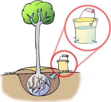 Letting your garden hose dribble at the base of large established trees (Remember to set a timer) for 2-3 hours, will ensure that their root-ball remains moist.