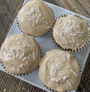 I’ve struggled to find a vegan cake that is moist, tasty and light in texture. The secret to these is both the dessicated coconut, and the coconut oil in the batter helps give the cakes a crunchy golden top. Delicious without the icing, decadent with.