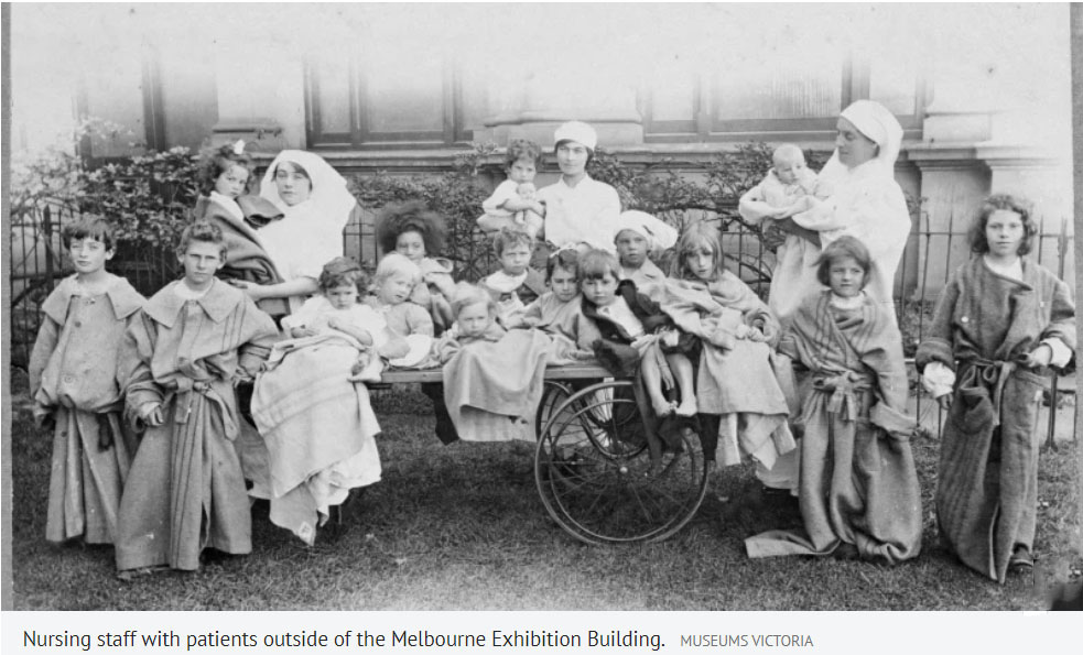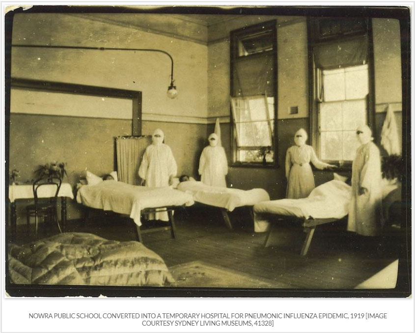 Despite the harrowing personal accounts in Frontline of the Pandemic: Australia 1919, there are also heroic stories from health professionals. Many graduate married nurses returned to work because of the great demand. The Red Cross rapidly organised relief stations which included housekeeping help and food supplies for patients, as well as medical and nursing support. Even a school was converted into a temporary hospital, such was the impact of the influenza. The Thomas Walker Convalescent Hospital at Concord, in Sydney, offered accommodation as an Influenza Hospital to the government for 80 patients which was accepted. Deeply committed nurses and doctors worked tirelessly day and night to assist patients to recover, and to stem the tide of deaths. The book has numerous descriptions of heroism across the country.