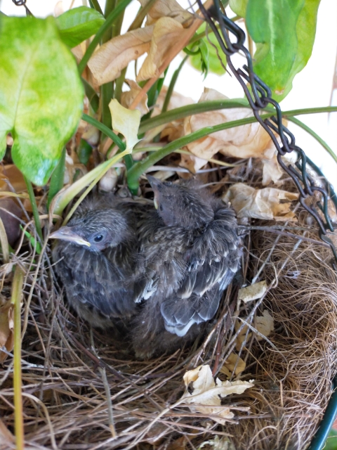 Several weeks later I heard the tiny twerps and there they were; two gaping yellow beaks attached to bald, featherless shapes. For mum it was back and forth on endless feeding trips, then late each afternoon settling down for the night cuddled together, dad on guard.