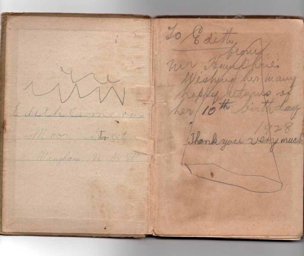 Edith then wrote very neatly in the cover her name and “Moon Street, Wingham NSW”.