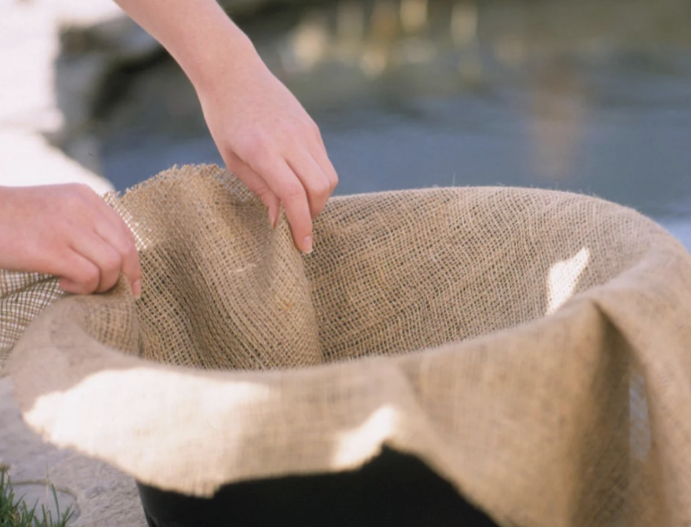 - Plant your waterlily into this, fold the hessian towards the centre around the base of the plant. Trim off any excess hessian and pack a good layer of pebbles around the top.