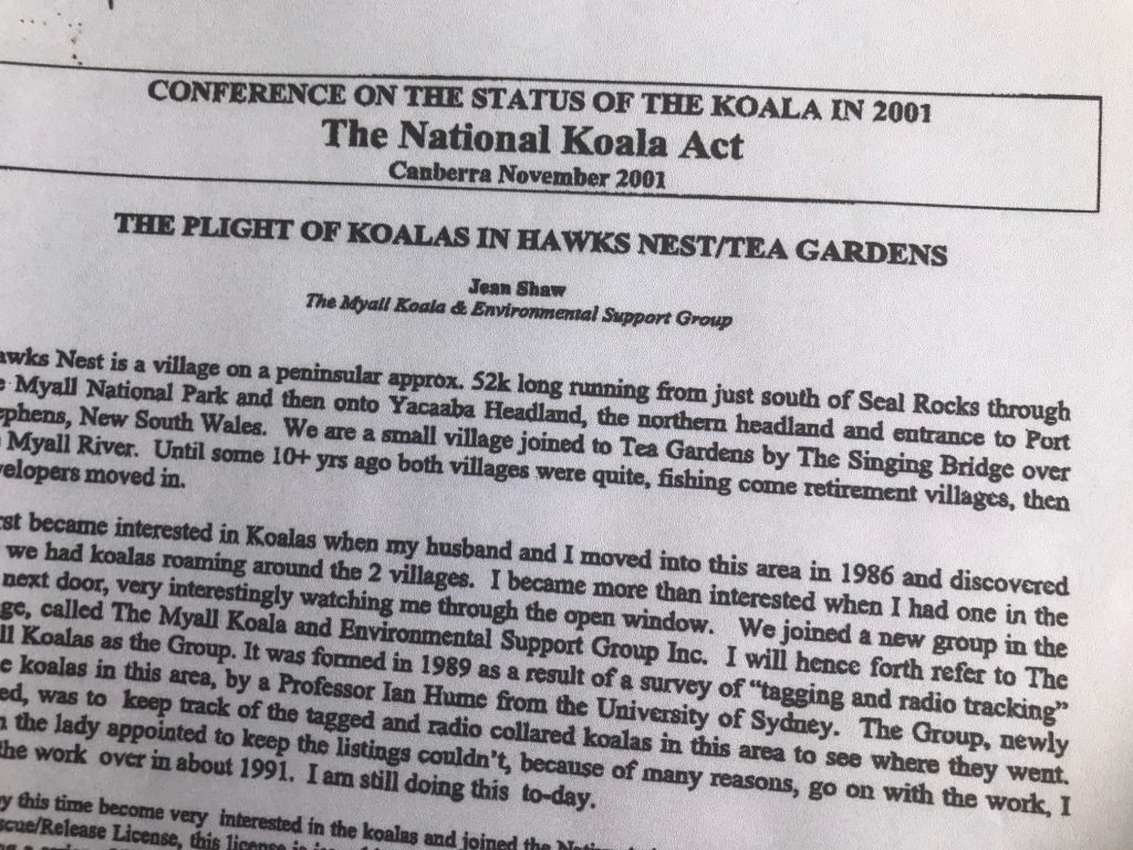 Exactly Twenty years ago in November 2001, a dedicated woman – Jean Shaw – presented a paper in Canberra to the Conference on the Status of the Koala in 2001. Jean’s article, entitled “The Plight of Koalas in Hawks Nest / Tea Gardens” was to advance the case for a National Koala Act.