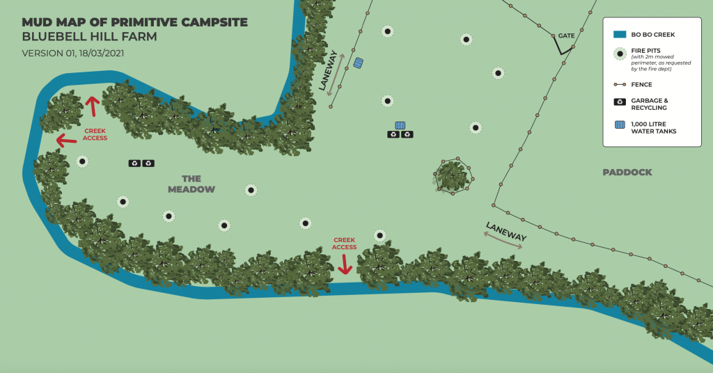 In early March 2021 we attended a DAP meeting with staff from MCC Environment, Water/Waste, Roads. We told them we were not providing any amenities. It was just a 5-acre grassy meadow where people brought their own water and dealt with their own waste – this is known as Primitive/Off Grid camping. What part of that needed a DA? There was no development!
