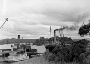 This lovely photo, by the late Newcastle press photographer Milton Merrilees, shows shipping on the Manning River during the 1930s at the time of the construction of Martin Bridge. The larger vessel is TSS Uki, later to be used as an auxiliary minesweeper during World War 2.