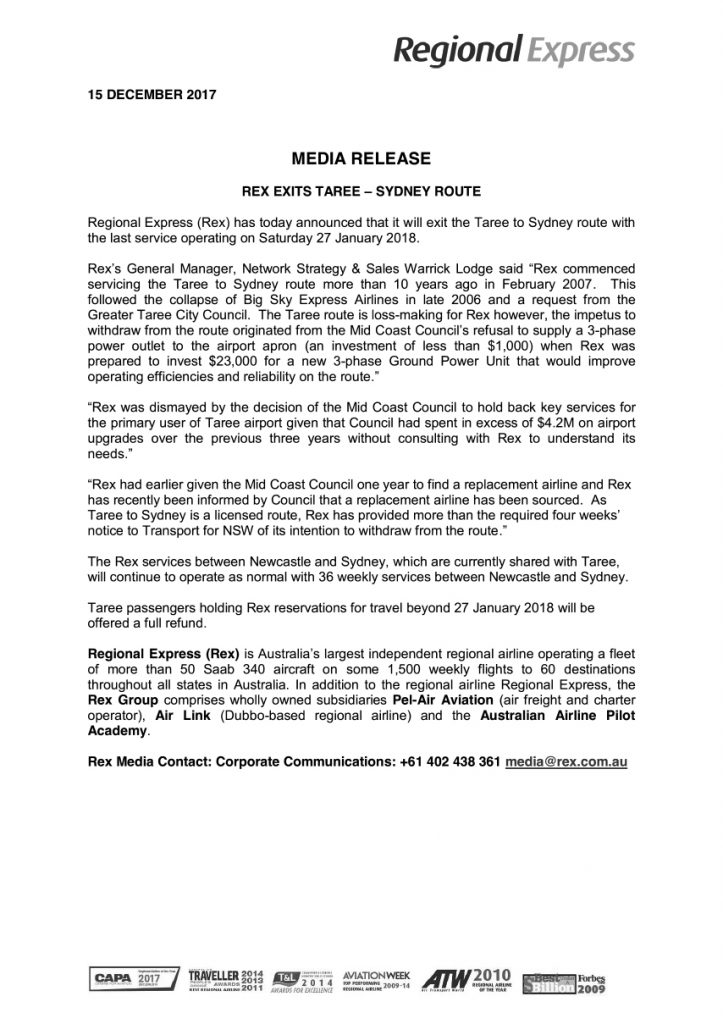 In relation to “REX”, as you would be aware the company is a previous supplier of RPT air services from the Taree Airport.